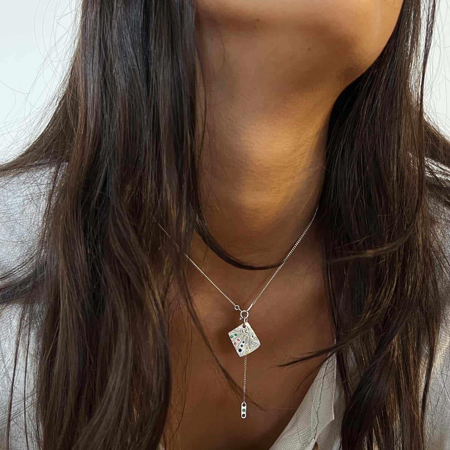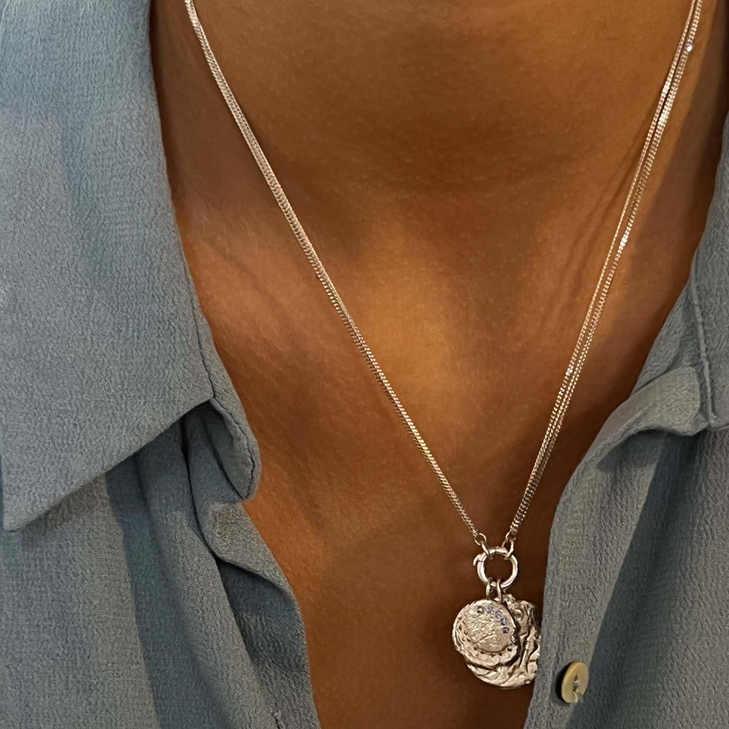 La colección está compuesta por catorce colgantes artesanales únicos que pueden adquirirse solos o combinarse con cinco modelos de cadenas hechas a mano. Realizados en plata 925/1000 y oro de 9 quilates reciclados, todas las creaciones están elaboradas con metales recuperados y reciclados ecológicos procedentes de la Unión Europea.