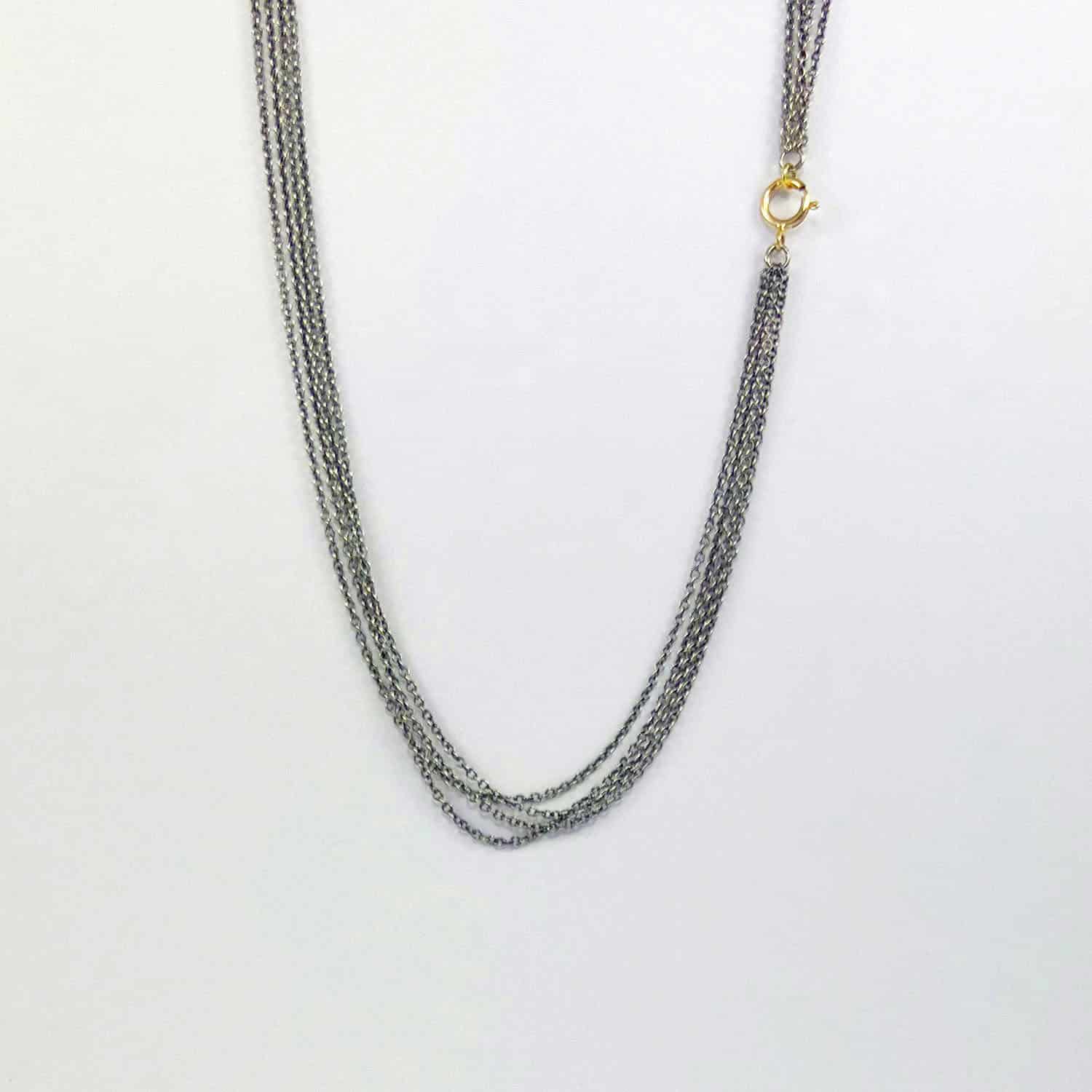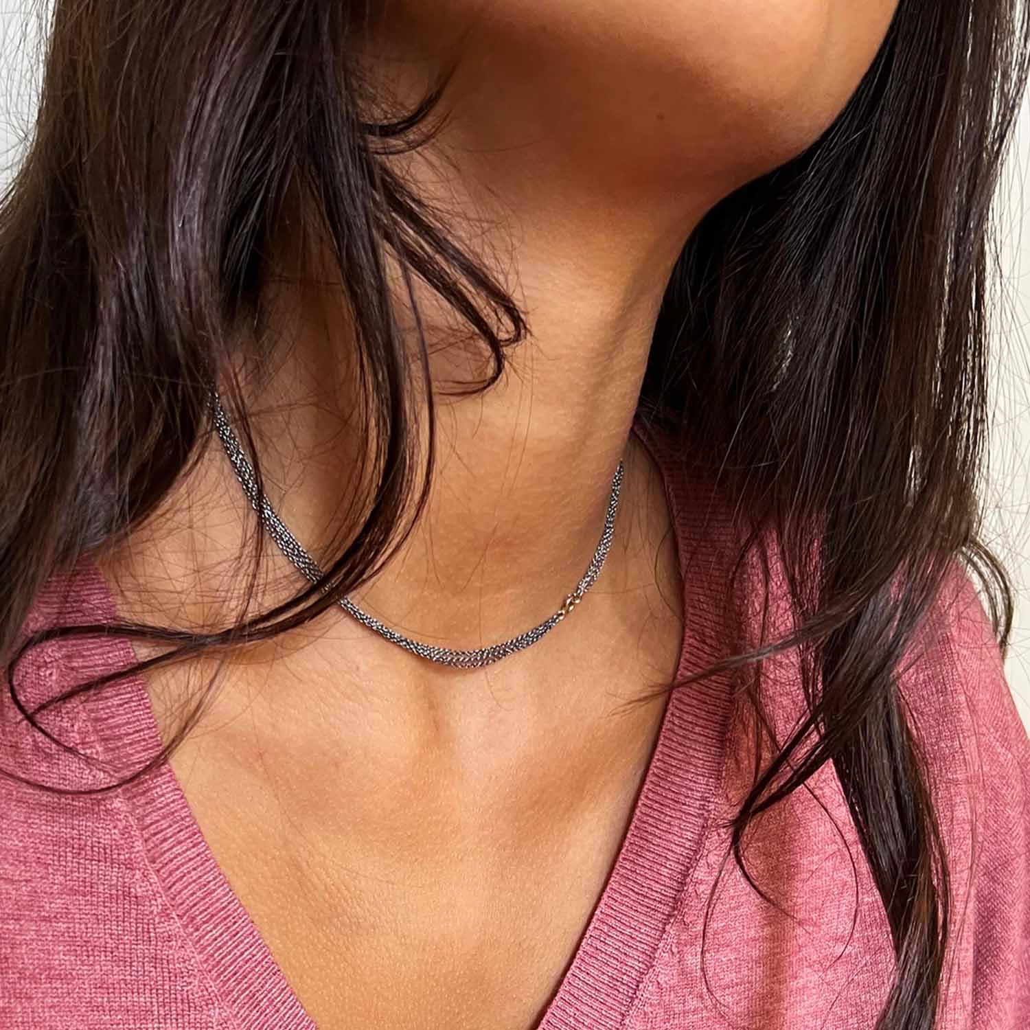 Creació delicada i versàtil. Cada cadena presenta un disseny singular i una expressió pròpia. Pensada per portar-se sola o com a suport per a penjolls, permet múltiples combinacions: enfilar-hi penjolls, fixar-los mitjançant la tanca o crear composicions personalitzades.