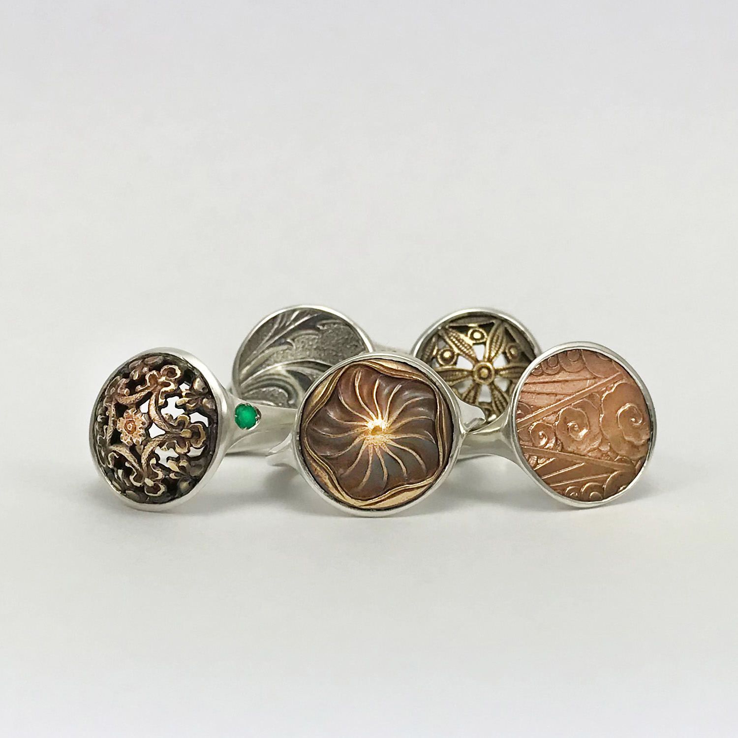 Pièce unique faite à la main de la Collection Envie du Passé, qui évoque les temps passés. Le détail central de cette pièce, serti, est un élément ancien récupéré et restauré. Une pièce qui se distingue par le volume singulier de son détail antique et le jeu harmonieux et contrasté des métaux, écho aux temps passés.