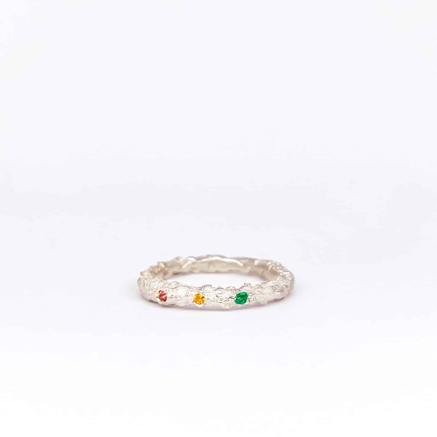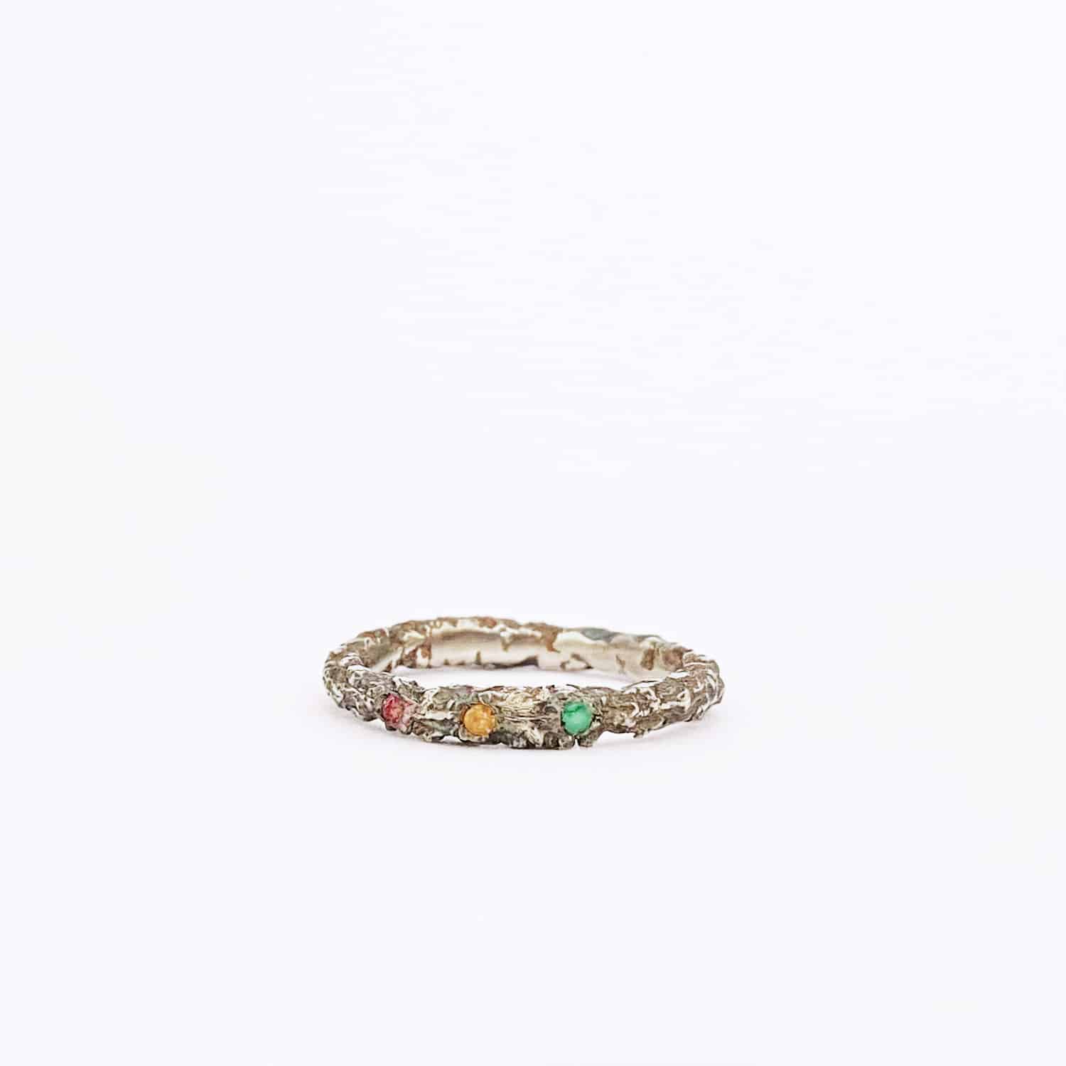 Quand la nature devient délicatesse. Bague de la Collection Paysages de Vie inspirée de la texture organique de l’arbre méditerranéen par excellence, le pin. Combinées à la délicate sélection de pierres précieuses et semi-précieuses, les différentes couleurs autour de la mer sont exprimées.