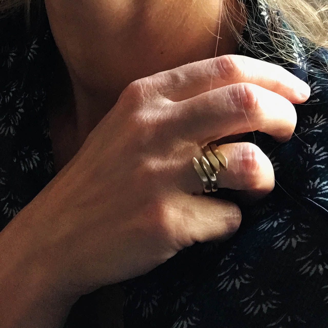 Bague de la Collection Surrounded by Beauty créée à la main inspirée d’une moulure ondulée et sinueuse d’un bâtiment Art Nouveau. Double S, deux bagues qui s’adaptent l’une à l’autre et, en même temps, entourent notre corps. Une pièce intemporelle et élégante.